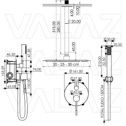 Material: cuerpo de la grifería latón, rociador y flexo anillado en acero inoxidable y alcachofa de mano en PVC.